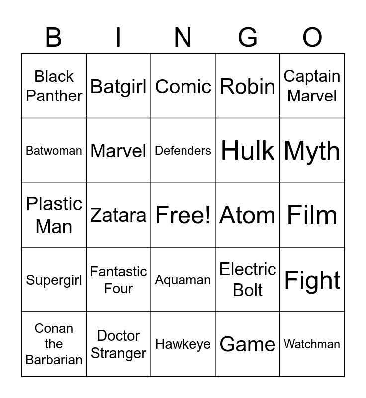 This bingo card has a free space and 24 words: Fantastic Four, Doctor Stranger, Defenders, Conan the Barbarian, Captain Marvel, Black Panther, Batwoman, Batgirl, Atom, Aquaman, Hulk, Plastic Man, Electric Bolt, Fight, Marvel, Game, Film, Comic, Myth, Zatara, Watchman, Supergirl, Robin and Hawkeye.
