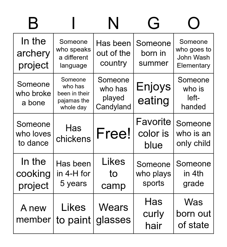 This bingo card has a free space and 29 words: A new member, Someone who likes math, Has chickens, Loves the beach, In the archery project, Has been out of the country, Someone who has been in their pajamas the whole day, Has been in 4-H for 5 years, Favorite color is blue, Likes to paint, Someone who is an only child, Was born out of state, Wears glasses, Has curly hair, Someone who is left-handed, Wearing a 4-H shirt, Likes to camp, In the cooking project, Someone who goes to John Wash Elementary, Someone who loves to dance, Someone who plays sports, Someone who plays an instrument, Enjoys eating, Someone who broke a bone, Someone born in summer, Someone who speaks a different language, Someone in 4th grade, Someone who has played Candyland and Someone who has baked a cake.