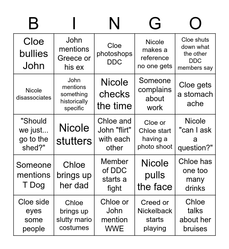 This bingo card has 25 words: Chloe brings up her dad, Chloe or John mention WWE, Nicole checks the time, Cloe side eyes some people, Cloe shuts down what the other DDC members say, Cloe bullies John, Nicole disassociates, John mentions Greece or his ex, Cloe or Chloe start having a photo shoot, Member of DDC starts a fight, Someone complains about work, "Should we just... go to the shed?", Nicole pulls the face, Chloe has one too many drinks, John mentions something historically specific, Chloe talks about her bruises, Nicole "can I ask a question?", Cloe photoshops DDC, Cloe gets a stomach ache, Nicole stutters, Chloe and John "flirt" with each other, Chloe brings up slutty mario costumes, Someone mentions T Dog, Nicole makes a reference no one gets and Creed or Nickelback starts playing.