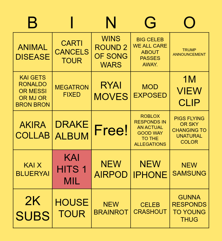This bingo card has a free space and 24 words: KAI HITS 1 MIL, HOUSE TOUR, RYAI MOVES, 2K SUBS, TRUMP ANNOUNCEMENT, ANIMAL DISEASE, KAI GETS RONALDO OR MESSI OR MJ OR BRON BRON, CARTI CANCELS TOUR, ROBLOX RESPONDS IN AN ACTUAL GOOD WAY TO THE ALLEGATIONS, NEW AIRPOD, MOD EXPOSED, AKIRA COLLAB, NEW IPHONE, NEW SAMSUNG, MEGATRON FIXED, CELEB CRASHOUT, PIGS FLYING OR SKY CHANGING TO UNATURAL COLOR, WINS ROUND 2 OF SONG WARS, 1M VIEW CLIP, DRAKE ALBUM, GUNNA RESPONDS TO YOUNG THUG, KAI X BLUERYAI, BIG CELEB WE ALL CARE ABOUT PASSES AWAY. and NEW BRAINROT.