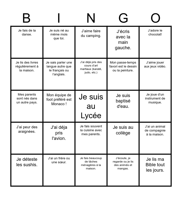 This bingo card has a free space and 24 words: J'ai déja pris l'avion., J’ai un frère ou une sœur., J’ai déjà pris des cours d’art martiaux (karaté, judo, etc.), Je déteste les sushis., J’adore le chocolat!, Je fais de la danse., Je lis des livres régulièrement à la maison., Je suis né au même mois que toi., Je suis baptisé d'eau., Je fais souvent la cuisine avec mes parents., Mon passe-temps favori est le dessin ou la peinture., Mes parents sont nés dans un autre pays., Je suis au collège, J’ai un animal de compagnie à la maison., Je sais parler une langue autre que le français ou l’anglais., J’écoute, je regarde ou je lis des animés et mangas., Je joue d’un instrument de musique., J’aime faire du camping., J’aime jouer aux jeux vidéo., Mon équipe de foot préféré est Monaco !, Je lis ma Bible tout les jours., J’ai peur des araignées., J’écris avec la main gauche. and Je fais beaucoup de tâches ménagères à la maison..