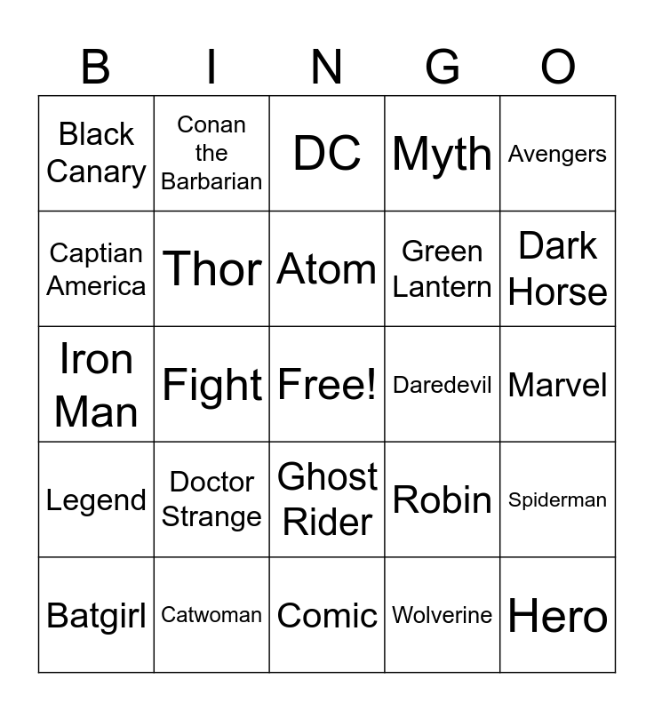 This bingo card has a free space and 24 words: Doctor Strange, Catwoman, Atom, Batgirl, Avengers, Black Canary, Captian America, Conan the Barbarian, Daredevil, Ghost Rider, Green Lantern, Iron Man, Robin, Spiderman, Thor, Wolverine, Marvel, DC, Dark Horse, Fight, Hero, Legend, Myth and Comic.