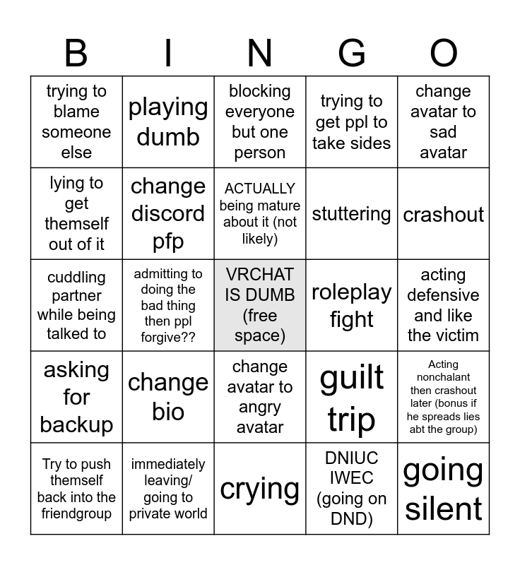 This bingo card has a free space and 24 words: change bio, immediately leaving/ going to private world, ACTUALLY being mature about it (not likely), Try to push themself back into the friendgroup, change avatar to sad avatar, trying to blame someone else, lying to get themself out of it, playing dumb, roleplay fight, change avatar to angry avatar, stuttering, cuddling partner while being talked to, guilt trip, Acting nonchalant then crashout later (bonus if he spreads lies abt the group), change discord pfp, DNIUC IWEC (going on DND), acting defensive and like the victim, blocking everyone but one person, crashout, admitting to doing the bad thing then ppl forgive??, going silent, asking for backup, trying to get ppl to take sides and crying.