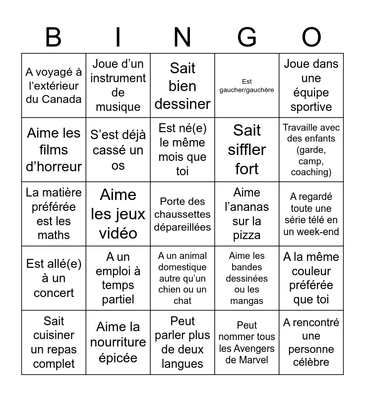 This bingo card has 25 words: A un emploi à temps partiel, Peut parler plus de deux langues, Est né(e) le même mois que toi, Sait cuisiner un repas complet, Joue dans une équipe sportive, A voyagé à l’extérieur du Canada, Aime les films d’horreur, Joue d’un instrument de musique, Aime l’ananas sur la pizza, A un animal domestique autre qu’un chien ou un chat, Sait siffler fort, La matière préférée est les maths, Aime les bandes dessinées ou les mangas, A la même couleur préférée que toi, S’est déjà cassé un os, A rencontré une personne célèbre, A regardé toute une série télé en un week-end, Sait bien dessiner, Travaille avec des enfants (garde, camp, coaching), Aime les jeux vidéo, Porte des chaussettes dépareillées, Aime la nourriture épicée, Est allé(e) à un concert, Est gaucher/gauchère and Peut nommer tous les Avengers de Marvel.