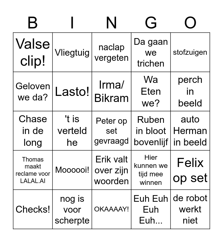 This bingo card has a free space and 24 words: Moooooi!, nog is voor scherpte, Irma/ Bikram, Checks!, stofzuigen, Valse clip!, Geloven we da?, Vliegtuig, Ruben in bloot bovenlijf, Erik valt over zijn woorden, Wa Eten we?, Chase in de long, Hier kunnen we tijd mee winnen, Felix op set, Lasto!, Euh Euh Euh Euh..., auto Herman in beeld, naclap vergeten, perch in beeld, 't is verteld he, de robot werkt niet, Thomas maakt reclame voor LALAL.AI, Da gaan we trichen and OKAAAAY!.