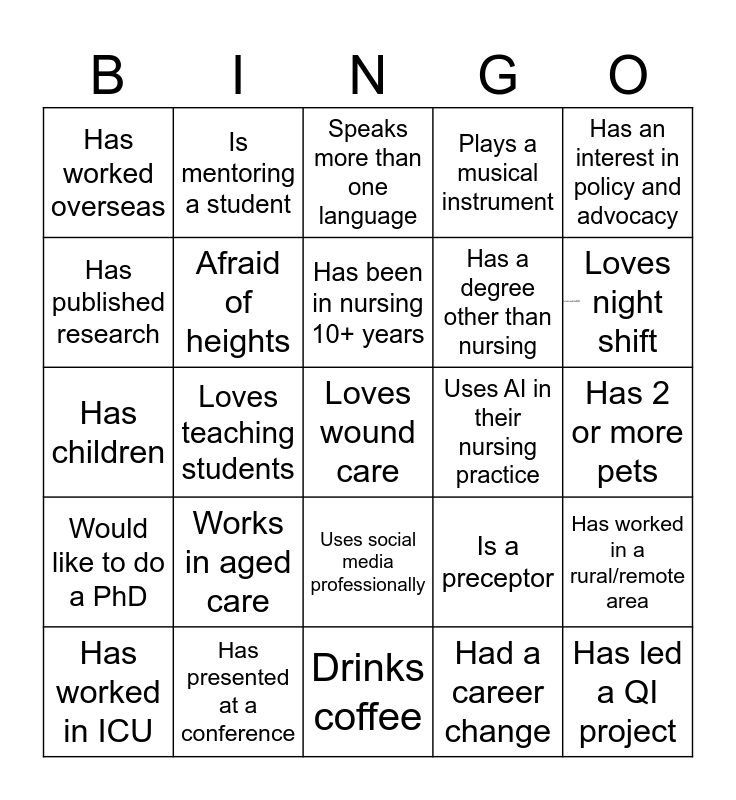 This bingo card has 1 images and 25 words: Would like to do a PhD, Has presented at a conference, Loves wound care, Had a career change, Has an interest in policy and advocacy, Has worked overseas, Is mentoring a student, Speaks more than one language, Uses AI in their nursing practice, Has worked in a rural/remote area, Has published research, Afraid of heights, Drinks coffee, Is a preceptor, Loves night shift, Has worked in ICU, Loves teaching students, Has been in nursing 10+ years, Has a degree other than nursing, Has 2 or more pets, Has children, Works in aged care, Uses social media professionally, Plays a musical instrument and Has led a QI project.