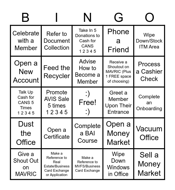 This bingo card has a free space and 24 words: Open a Certificate, Make a Reference to Real Estate/Business Card Exchange or Application, Advise How to Become a Member, Give a Shout Out on MAVRIC, Wipe Down/Stock ITM Area, Celebrate with a Member, Open a New Account, Refer to Document Collection, Greet a Member Upon Their Entrance, Complete a BAI Course, Receive a Shoutout on MAVRIC (Plus 1 FREE space of choosing), Talk Up Cash for CANS 5 Times 1 2 3 4 5, Open a Money Market, Vacuum Office, Feed the Recycler, Wipe Down Windows in Office, Complete an Onboarding, Take In 5 Donations to Cash for CANS 1 2 3 4 5, Process a Cashier Check, Promote AVIS Sale 5 times 1 2 3 4 5, Sell a Money Market, Dust the Office, Phone a Friend and Make a Reference to MVFS/Business Card Exchange.