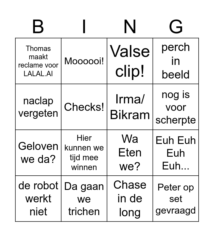 This bingo card has 16 words: Da gaan we trichen, Euh Euh Euh Euh..., Valse clip!, Thomas maakt reclame voor LALAL.AI, Geloven we da?, Moooooi!, Wa Eten we?, Chase in de long, naclap vergeten, Checks!, de robot werkt niet, perch in beeld, Hier kunnen we tijd mee winnen, nog is voor scherpte, Irma/ Bikram and Peter op set gevraagd.