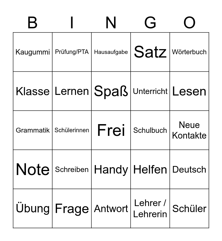 This bingo card has a free space and 28 words: Deutsch, Schule, Unterricht, Lehrer / Lehrerin, Klasse, Hausaufgabe, Prüfung/PTA, Note, Schulbuch, Übung, Grammatik, Satz, Frage, Antwort, Lesen, Sprechen, Schreiben, Lernen, Spaß, Handy, Kaugummi, Lehrer, Schüler, Schülerinnen, Neue Kontakte, Helfen, Wörterbuch and Sitzplan.