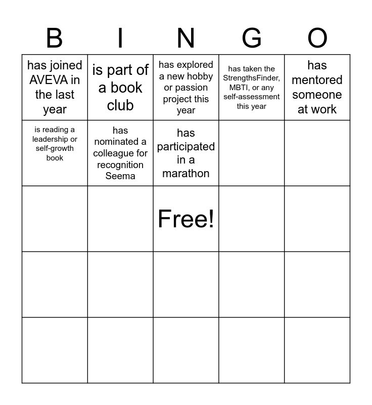 This bingo card has a free space and 8 words: is reading a leadership or self-growth book, has explored a new hobby or passion project this year, is part of a book club, has nominated a colleague for recognition Seema, has joined AVEVA in the last year, has mentored someone at work, has taken the StrengthsFinder, MBTI, or any self-assessment this year and has participated in a marathon.