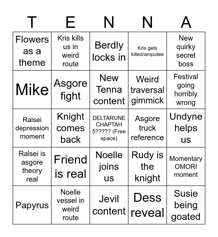 This bingo card has a free space and 24 words: Friend is real, Noelle vessel in weird route, New Tenna content, Papyrus, New quirky secret boss, Flowers as a theme, Mike, Kris kills us in weird route, Asgore truck reference, Noelle joins us, Weird traversal gimmick, Ralsei depression moment, Rudy is the knight, Momentary OMORI moment, Asgore fight, Dess reveal, Undyne helps us, Berdly locks in, Festival going horribly wrong, Knight comes back, Susie being goated, Ralsei is asgore theory real, Kris gets killed/amputee and Jevil content.