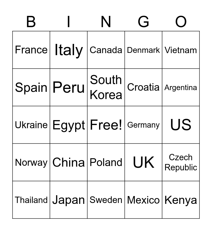 This bingo card has a free space and 24 words: China, Japan, South Korea, Thailand, Vietnam, France, Spain, Italy, Germany, Poland, Croatia, Ukraine, UK, Czech Republic, Peru, Mexico, US, Canada, Argentina, Egypt, Kenya, Norway, Denmark and Sweden.