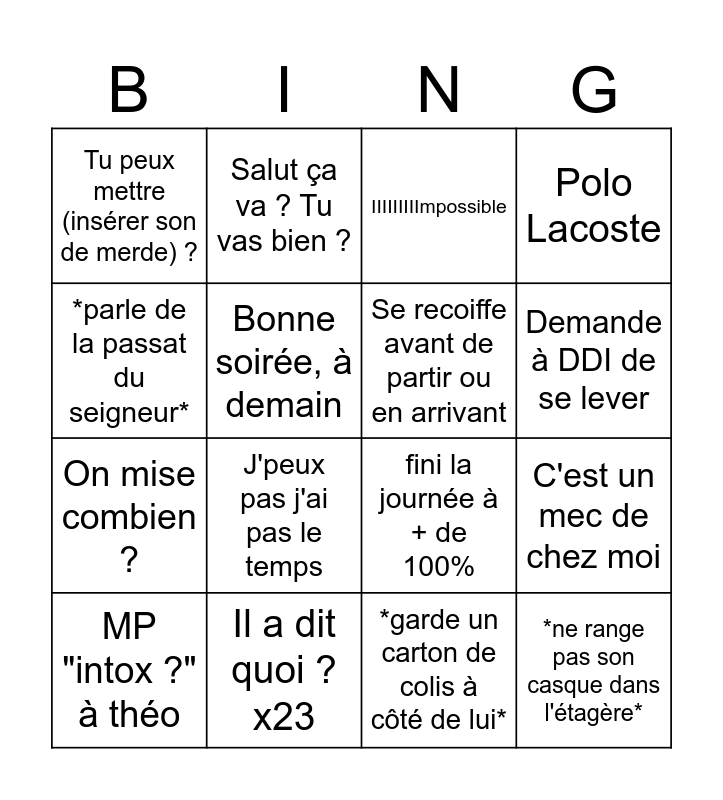This bingo card has 16 words: Il a dit quoi ? x23, C'est un mec de chez moi, IIIIIIIIImpossible, Tu peux mettre (insérer son de merde) ?, On mise combien ?, Salut ça va ? Tu vas bien ?, fini la journée à + de 100%, *garde un carton de colis à côté de lui*, *parle de la passat du seigneur*, Bonne soirée, à demain, MP "intox ?" à théo, Polo Lacoste, J'peux pas j'ai pas le temps, Demande à DDI de se lever, Se recoiffe avant de partir ou en arrivant and *ne range pas son casque dans l'étagère*.