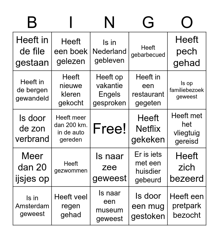 This bingo card has a free space and 24 words: Heeft gezwommen, Heeft veel regen gehad, Heeft op vakantie Engels gesproken, Is in Amsterdam geweest, Heeft pech gehad, Heeft in de file gestaan, Heeft in de bergen gewandeld, Heeft een boek gelezen, Heeft Netflix gekeken, Is naar zee geweest, Heeft in een restaurant gegeten, Is door de zon verbrand, Er is iets met een huisdier gebeurd, Heeft zich bezeerd, Heeft nieuwe kleren gekocht, Is door een mug gestoken, Heeft met het vliegtuig gereisd, Is in Nederland gebleven, Is op familiebezoek geweest, Heeft meer dan 200 km. in de auto gereden, Heeft een pretpark bezocht, Meer dan 20 ijsjes op, Heeft gebarbecued and Is naar een museum geweest.