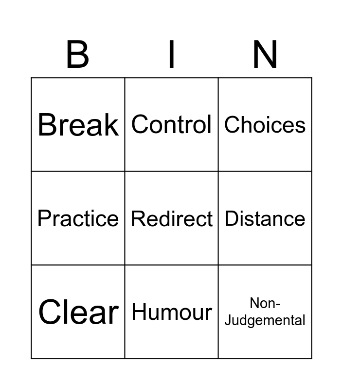 This bingo card has 22 words: Co-Regulation, Family, Control, Non-Threatening, Distance, Clear, Break, Choices, Diversion, Hobbies, Non-Judgemental, Practice, Pets, Listen, Avoid, Personal Space, Relaxed, Validate, Calm, Redirect, Humour and Respectful.