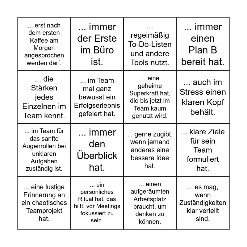 This bingo card has 19 words: ... gerne zugibt, wenn jemand anderes eine bessere Idee hat., ... es liebt, Listen, Prozesse oder Pläne zu erstellen., ... regelmäßig To-Do-Listen und andere Tools nutzt., ... es mag, wenn Zuständigkeiten klar verteilt sind., ... klare Ziele für sein Team formuliert hat., ... die Stärken jedes Einzelnen im Team kennt., ... einen aufgeräumten Arbeitsplatz braucht, um denken zu können., ... erst nach dem ersten Kaffee am Morgen angesprochen werden darf., ... immer der Erste im Büro ist., ... im Team für das sanfte Augenrollen bei unklaren Aufgaben zuständig ist., ... immer den Überblick hat., ... im Team mal ganz bewusst ein Erfolgserlebnis gefeiert hat., ... eine geheime Superkraft hat, die bis jetzt im Team kaum genutzt wird., ... ein persönliches Ritual hat, das hilft, vor Meetings fokussiert zu sein., ... eine lustige Erinnerung an ein chaotisches Teamprojekt hat., ... schon einmal einen eigenen Fehler offen im Team geteilt hat., ... immer einen Plan B bereit hat., ... auch im Stress einen klaren Kopf behält. and ... vor allem mit dem Koffein-High leistungsfähig ist..