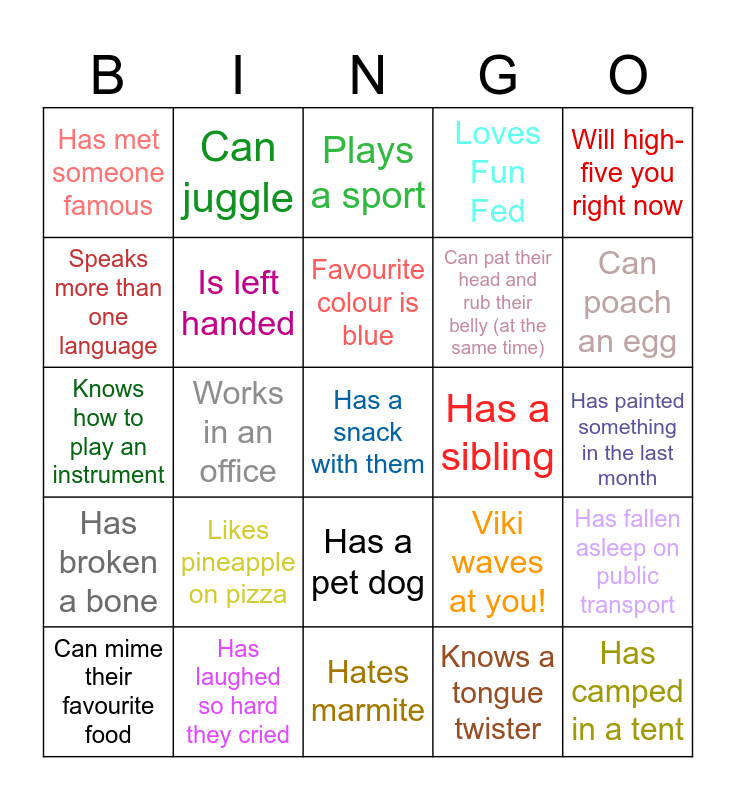 This bingo card has 25 words: Likes pineapple on pizza, Hates marmite, Favourite colour is blue, Can mime their favourite food, Will high-five you right now, Has met someone famous, Speaks more than one language, Can juggle, Has a sibling, Has a pet dog, Can pat their head and rub their belly (at the same time), Knows how to play an instrument, Viki waves at you!, Has fallen asleep on public transport, Is left handed, Has camped in a tent, Has painted something in the last month, Plays a sport, Can poach an egg, Works in an office, Has a snack with them, Has laughed so hard they cried, Has broken a bone, Loves Fun Fed and Knows a tongue twister.