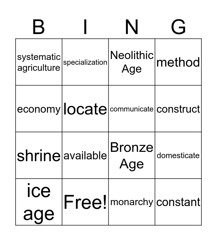 This bingo card has 16 words: Free!, domesticate, Neolithic Age, systematic agriculture, shrine, specialization, Bronze Age, monarchy, economy, locate, ice age, method, available, construct, communicate and constant.