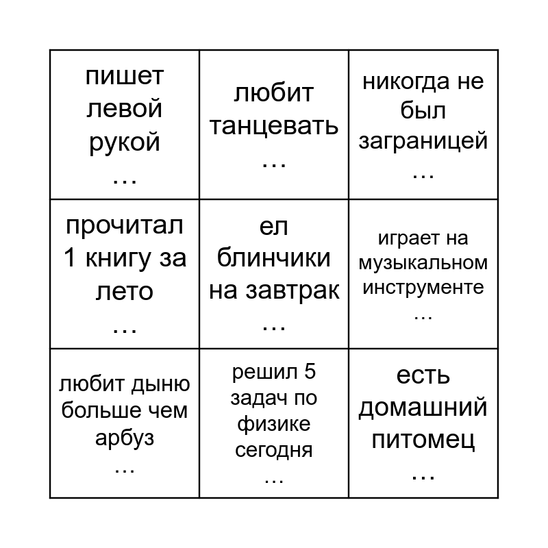 This bingo card has 9 words: любит дыню больше чем арбуз …, никогда не был заграницей …, любит танцевать …, прочитал 1 книгу за лето …, пишет левой рукой …, играет на музыкальном инструменте …, ел блинчики на завтрак …, есть домашний питомец … and решил 5 задач по физике сегодня ….