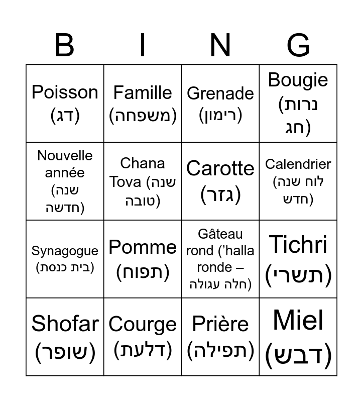 This bingo card has 18 words: Pomme (תפוח), Miel (דבש), Grenade (רימון), Poisson (דג), Gâteau rond (’halla ronde – חלה עגולה), Bougie (נרות חג), Shofar (שופר), Famille (משפחה), Calendrier (לוח שנה חדש), Synagogue (בית כנסת), Prière (תפילה), Nouvelle année (שנה חדשה), Tichri (תשרי), Chana Tova (שנה טובה), Carotte (גזר), Dattes (תמרים), Courge (דלעת) and Betterave (סלק).