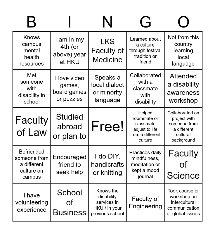 This bingo card has a free space and 39 words: I do regular sport or physical activity, I have a music, art or reading hobby, I love to cook or bake, I love video games, board games or puzzles, I have volunteering experience, I do DIY, handicrafts or knitting, Speaks a local dialect or minority language, Speaks 2+ languages, Not from this country learning local language, Befriended someone from a different culture on campus, Studied abroad or plan to, Learned about a culture through festival tradition or friend, Took course or workshop on intercultural communication or global issues, Collaborated on project with someone from a different cultural background, Helped roommate or classmate adjust to life from a different culture, Encouraged friend to seek help, Supported a friend through a tough time, Knows campus mental health resources, Have a self-care routine for stress, Practices daily mindfulness, meditation or kept a mood journal, Met someone with disability in school, Knows the disability services in HKU / in your previous school, Collaborated with a classmate with disability, Attended a disability awareness workshop, I am a undergraduate, I am a postgraduate, This is my first year at HKU, This is my second year at HKU, This is my third year at HKU, I am in my 4th (or above) year at HKU, Faculty of Arts, Faculty of Social Sciences, LKS Faculty of Medicine, School of Business, Faculty of Engineering, Faculty of Education, Faculty of Science, Faculty of Law and Faculty of Architecture.
