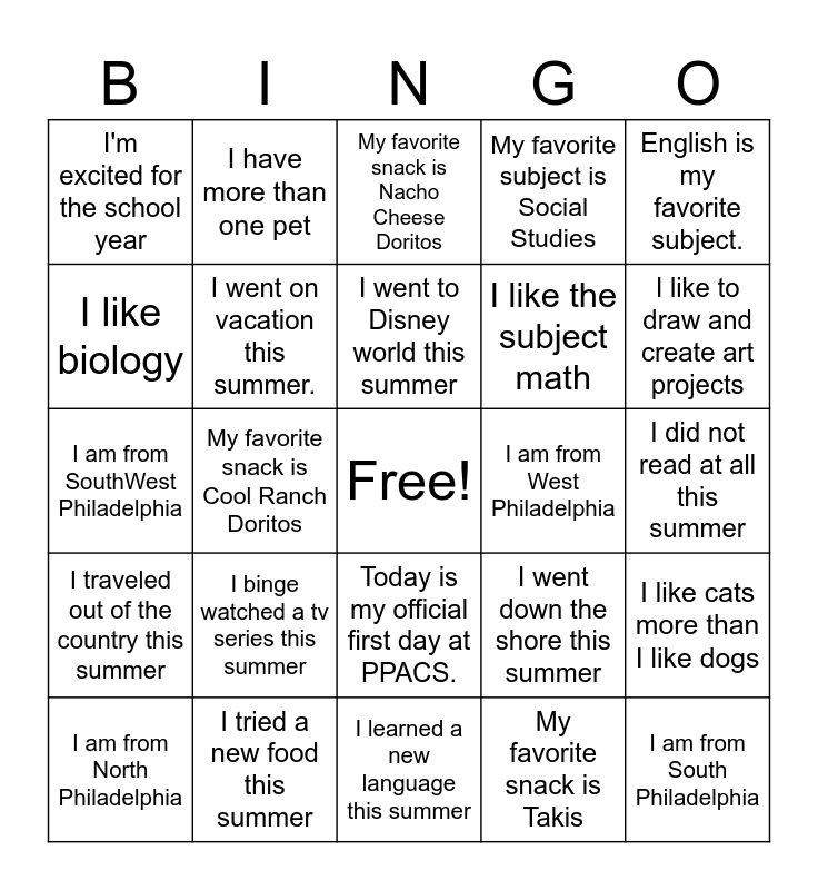 This bingo card has a free space and 24 words: I binge watched a tv series this summer, I tried a new food this summer, I went to Disney world this summer, I am from North Philadelphia, English is my favorite subject., I'm excited for the school year, I like biology, I have more than one pet, I am from West Philadelphia, Today is my official first day at PPACS., I like the subject math, I am from SouthWest Philadelphia, I went down the shore this summer, I like cats more than I like dogs, I went on vacation this summer., My favorite snack is Takis, I did not read at all this summer, My favorite snack is Nacho Cheese Doritos, I like to draw and create art projects, My favorite snack is Cool Ranch Doritos, I am from South Philadelphia, I traveled out of the country this summer, My favorite subject is Social Studies and I learned a new language this summer.