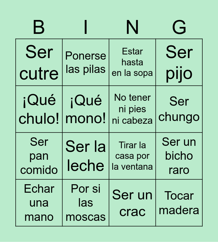 This bingo card has 20 words: Ser un bicho raro, ¡Qué guay!, Estar hasta en la sopa, Vale, Echar una mano, ¡Qué chulo!, Por si las moscas, Ser cutre, Ser pan comido, Ponerse las pilas, Ser la leche, Tirar la casa por la ventana, ¡Qué mono!, Tocar madera, No tener ni pies ni cabeza, Molar, Ser chungo, Ser pijo, Ser un crac and Pasta.