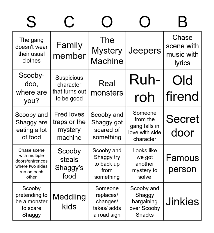 This bingo card has a free space and 34 words: Velma looses her glasses, Scooby and Shaggy bargaining over Scooby Snacks, Scooby and Shaggy dressing up/blending in the background to trick the monster, Scooby mimics the monster to show the gang what he saw, Chase scene with multiple doors/entrences where two sides run on each other, Suspicious character that turns out to be good, Chase scene with music with lyrics, Scooby pretending to be a monster to scare Shaggy, Family member, The story is set not in US, Real monsters, The Mystery Machine, Velma notices something suspicious about someone, Velma explains who is the villain, Someone from the gang falls in love with side character, Old firend, Meddling kids, Scooby and Shaggy are eating a lot of food, Scooby steals Shaggy's food, Looks like we got another mystery to solve, Scooby and Shaggy try to back up from something, Let's split up gang, The gang doesn't wear their usual clothes, Secret door, Someone replaces/ changes/ takes/ adds a road sign, Jinkies, Jeepers, Zoinks, Ruh-roh, Scooby-doo, where are you?, Mind Control/Hypnosis, Fred loves traps or the mystery machine, Famous person and Shaggy is randomly really good at something.