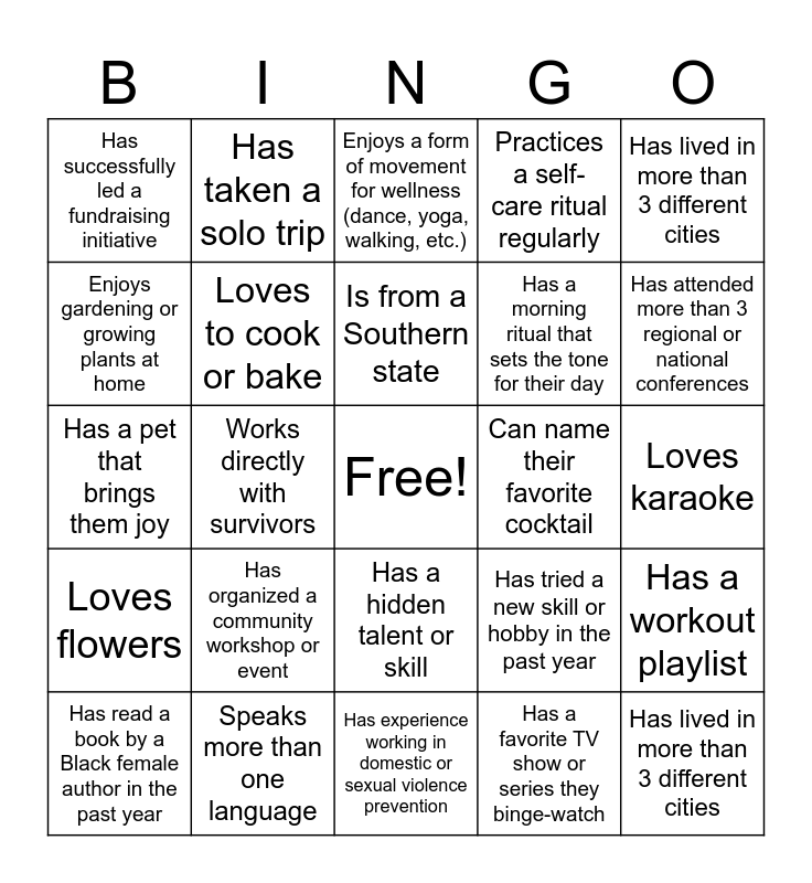 This bingo card has a free space and 24 words: Has organized a community workshop or event, Speaks more than one language, Is from a Southern state, Has read a book by a Black female author in the past year, Has lived in more than 3 different cities, Has successfully led a fundraising initiative, Enjoys gardening or growing plants at home, Has taken a solo trip, Can name their favorite cocktail, Has a hidden talent or skill, Has a morning ritual that sets the tone for their day, Has a pet that brings them joy, Has tried a new skill or hobby in the past year, Has a workout playlist, Loves to cook or bake, Has a favorite TV show or series they binge-watch, Loves karaoke, Enjoys a form of movement for wellness (dance, yoga, walking, etc.), Has attended more than 3 regional or national conferences, Works directly with survivors, Has lived in more than 3 different cities, Loves flowers, Practices a self-care ritual regularly and Has experience working in domestic or sexual violence prevention.