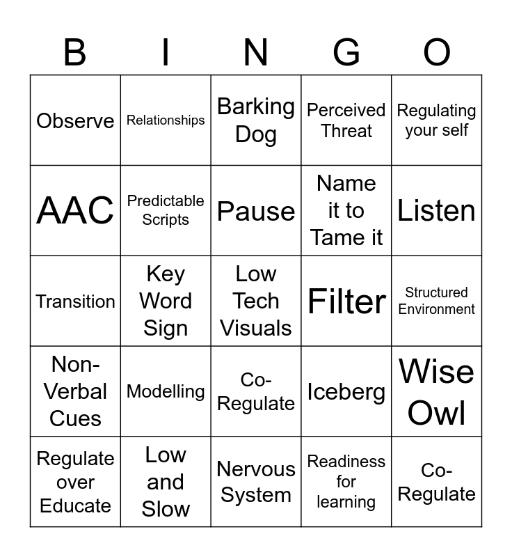 This bingo card has 26 words: Co-Regulate, Readiness for learning, Pause, Low and Slow, Regulating your self, Observe, AAC, Relationships, Structured Environment, Iceberg, Name it to Tame it, Transition, Wise Owl, Regulate over Educate, Key Word Sign, Body Language, Perceived Threat, Non-Verbal Cues, Barking Dog, Low Tech Visuals, Listen, Nervous System, Filter, Modelling, Predictable Scripts and Co-Regulate.