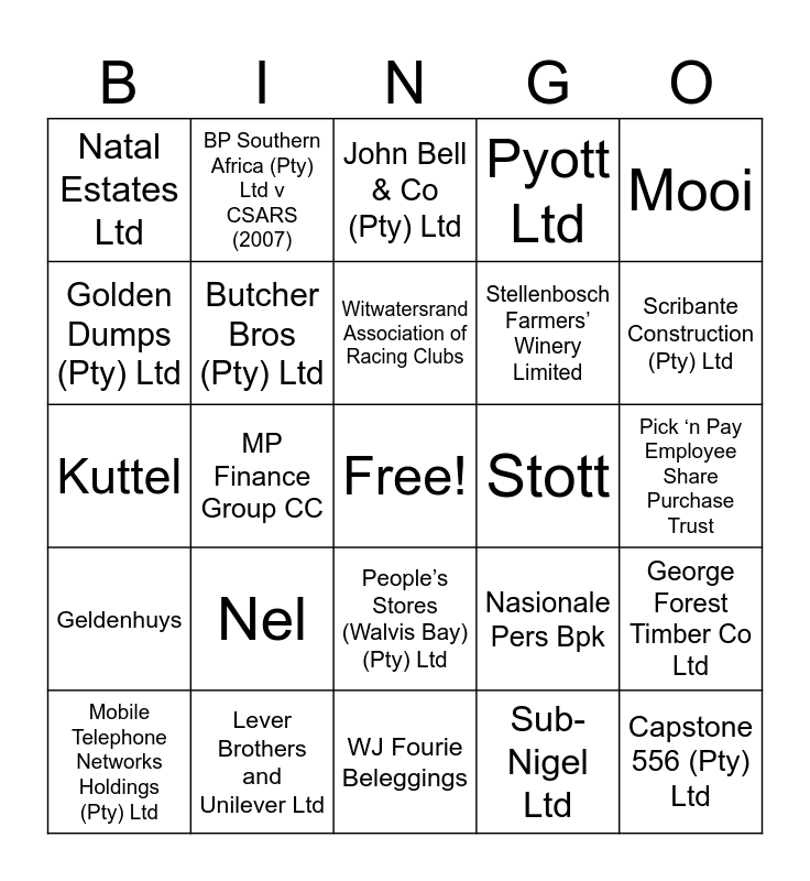 This bingo card has a free space and 41 words: Cohen, Kuttel, Brummeria Renaissance (Pty) Ltd, Butcher Bros (Pty) Ltd, Lever Brothers and Unilever Ltd, People’s Stores (Walvis Bay) (Pty) Ltd, Witwatersrand Association of Racing Clubs, Lategan, Mooi, Geldenhuys, MP Finance Group CC, Pyott Ltd, Capstone 556 (Pty) Ltd, Pick ‘n Pay Employee Share Purchase Trust, Stott, Nel, Nussbaum, Natal Estates Ltd, Founders Hill (Pty) Ltd, John Bell & Co (Pty) Ltd, George Forest Timber Co Ltd, Nel, WJ Fourie Beleggings, Stellenbosch Farmers’ Winery Limited, Delagoa Bay Cigarette Co Ltd, MP Finance Group CC, Sub-Nigel Ltd, Burgess, Scribante Construction (Pty) Ltd, Port Elizabeth Electric Tramway Co Ltd, Joffe & Co (Pty) Ltd, BP Southern Africa (Pty) Ltd v CSARS (2007), Mobile Telephone Networks Holdings (Pty) Ltd, Edgars Stores Ltd, Nasionale Pers Bpk, Golden Dumps (Pty) Ltd, Labat, New State Areas Ltd v CIR, Rand Mines (Mining & Services) Ltd, CSARS v BP South Africa (Pty) Ltd (2006) and Warner Lambert SA (Pty) Ltd.