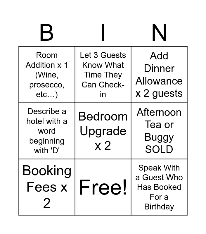 This bingo card has 10 words: Free!, Add Dinner Allowance x 2 guests, Room Addition x 1 (Wine, prosecco, etc…), Bedroom Upgrade x 2, Describe a hotel with a word beginning with 'D', Booking Fees x 2, Let 3 Guests Know What Time They Can Check-in, Spa Days Booked x 2, Afternoon Tea or Buggy SOLD and Speak With a Guest Who Has Booked For a Birthday.