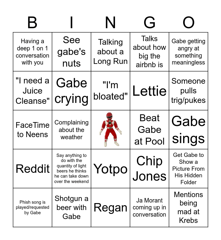 This bingo card has a free space and 24 words: Say anything to do with the quantity of light beers he thinks he can take down over the weekend, Shotgun a beer with Gabe, "I'm bloated", Phish song is played/requested by Gabe, Gabe getting angry at something meaningless, Having a deep 1 on 1 conversation with you, "I need a Juice Cleanse", See gabe's nuts, Beat Gabe at Pool, Yotpo, Lettie, FaceTime to Neens, Chip Jones, Get Gabe to Show a Picture From His Hidden Folder, Gabe crying, Ja Morant coming up in conversation, Gabe sings, Talking about a Long Run, Someone pulls trig/pukes, Complaining about the weather, Mentions being mad at Krebs, Reddit, Talks about how big the airbnb is and Regan.