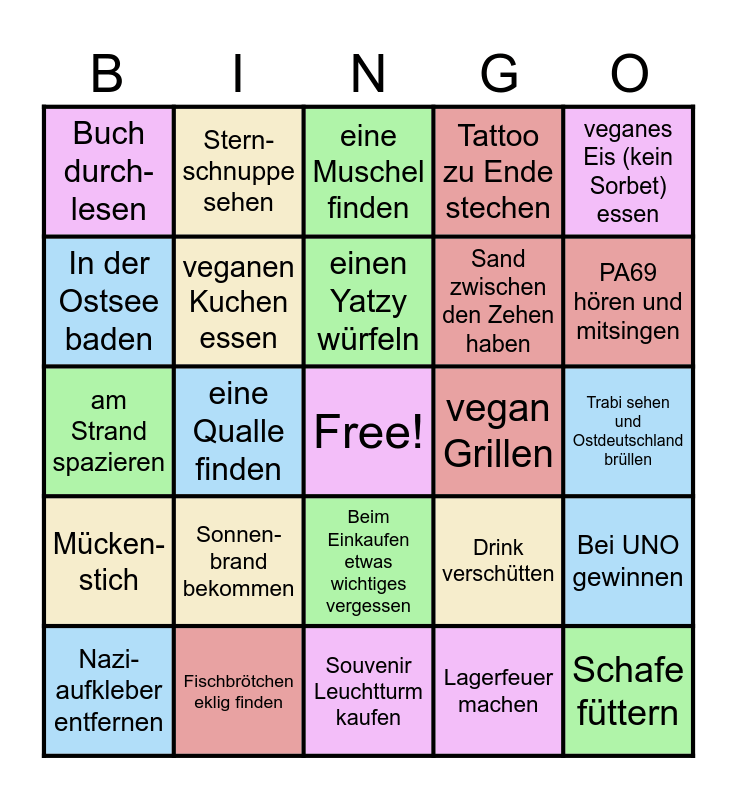 This bingo card has a free space and 24 words: Sonnen-brand bekommen, Fischbrötchen eklig finden, einen Yatzy würfeln, Nazi-aufkleber entfernen, veganes Eis (kein Sorbet) essen, Buch durch-lesen, In der Ostsee baden, Stern-schnuppe sehen, vegan Grillen, Beim Einkaufen etwas wichtiges vergessen, Sand zwischen den Zehen haben, am Strand spazieren, Drink verschütten, Bei UNO gewinnen, veganen Kuchen essen, Lagerfeuer machen, Trabi sehen und Ostdeutschland brüllen, eine Muschel finden, PA69 hören und mitsingen, eine Qualle finden, Schafe füttern, Mücken-stich, Tattoo zu Ende stechen and Souvenir Leuchtturm kaufen.