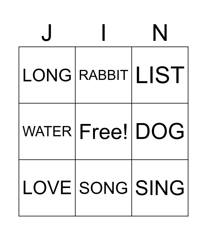 This bingo card has a free space and 8 words: DOG, LIST, RABBIT, LOVE, LONG, SING, WATER and SONG.