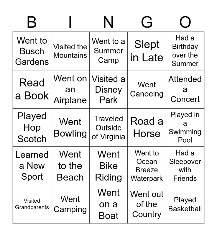 This bingo card has a free space and 24 words: Went to the Beach, Went Camping, Visited a Disney Park, Visited Grandparents, Had a Birthday over the Summer, Went to Busch Gardens, Read a Book, Visited the Mountains, Road a Horse, Went Bike Riding, Went Canoeing, Played Hop Scotch, Went to Ocean Breeze Waterpark, Had a Sleepover with Friends, Went on an Airplane, Went out of the Country, Played in a Swimming Pool, Went to a Summer Camp, Attended a Concert, Went Bowling, Played Basketball, Learned a New Sport, Slept in Late and Went on a Boat.