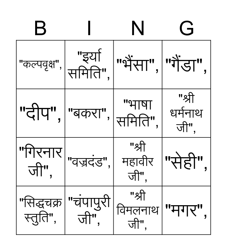 This bingo card has 91 words: Free!, श्री ऋषभनाथ जी",, "श्री अजितनाथ जी",, "श्री संभवनाथ जी",, "श्री अभिनंदननाथ जी",, "श्री सुमतिनाथ जी",, "श्री पद्मप्रभ जी",, "श्री सुपार्श्वनाथ जी",, "श्री चन्द्रप्रभ जी",, "श्री पुष्पदंत जी",, "श्री शीतलनाथ जी",, "श्री श्रेयांसनाथ जी",, "श्री वासुपूज्य जी",, "श्री विमलनाथ जी",, "श्री अनंतनाथ जी",, "श्री धर्मनाथ जी",, "श्री शांतिनाथ जी",, "श्री कुंथुनाथ जी",, "श्री अरहनाथ जी",, "श्री मल्लिनाथ जी",, "श्री मुनिस्रुव्रतनाथ जी",, "श्री नमिनाथ जी",, "श्री नेमिनाथ जी",, "श्री पार्श्वनाथ जी",, "श्री महावीर जी",, "बैल",, "हाथी",, "अश्व (घोड़ा)",, "बंदर",, "चकवा",, "कमल",, "स्वस्तिक",, "चन्द्रमा",, "मगर",, "कल्पवृक्ष",, "गैंडा",, "भैंसा",, "शूकर",, "सेही",, "वज्रदंड",, "मृग (हिरण)",, "बकरा",, "मछली",, "कलश",, "कछुआ",, "नीलकमल",, "शंख",, "सर्प",, "सिंह",, "सम्मेद शिखरजी",, "पावापुरीजी",, "गिरनार जी",, "हस्तिनापुर जी",, "अष्टापद",, "श्रवणबेलगोला जी",, "खंडगिरि-उदयगिरि जी",, "चंपापुरी जी",, "कुंडलपुर जी",, "गुणावा जी",, "राजग्रही जी",, "पावागढ़ जी",, "फल",, "तिजारा जी",, "श्री महावीरजी",, "केशरिया जी",, "चांदखेड़ी जी",, "बड़ागांव जी",, "सोनागीरजी",, "भक्तामर स्तोत्र",, "बारह भावना",, "मेरी भावना",, "सिद्धचक्र स्तुति",, "महाविराष्टक",, "णमोकार मंत्र",, "इर्या समिति",, "भाषा समिति",, "एषणा समिति",, "आदान निक्षेप समिति",, "उत्सर्ग समिति",, "आचार्य पुष्पदंत जी",, "धूप",, "दीप",, "आदिपुराण",, "तत्त्वार्थसूत्र",, "षट्खंडागम",, "जिनवाणी",, "जल",, "चंदन",, "अक्षत",, "पुष्प", and "नैवेद्य".