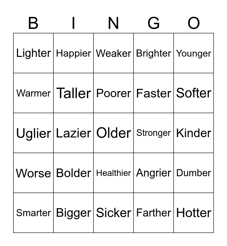 This bingo card has 59 words: Free!, Bigger, Better, Worse, Farther, Smaller, Taller, Shorter, Faster, Slower, Brighter, Darker, Warmer, Colder, Heavier, Lighter, Older, Younger, Richer, Poorer, Stronger, Weaker, Smarter, Dumber, Cleaner, Dirtier, Quieter, Louder, Softer, Harder, Sharper, Duller, Nicer, Meaner, Happier, Sadder, Busier, Lazier, Prettier, Uglier, Funnier, Bolder, Kinder, Ruder, Greener, Browner, Redder, Bluer, Healthier, Sicker, Safer, Riskier, Simpler, Trickier, Friendlier, Angrier, Cooler, Hotter and Taller.