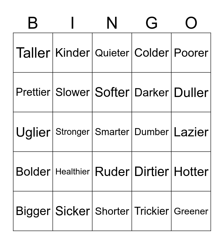 This bingo card has 56 words: Free!, Bigger, Smaller, Taller, Shorter, Faster, Slower, Brighter, Darker, Warmer, Colder, Heavier, Lighter, Older, Younger, Richer, Poorer, Stronger, Weaker, Smarter, Dumber, Cleaner, Dirtier, Quieter, Louder, Softer, Harder, Sharper, Duller, Nicer, Meaner, Happier, Sadder, Busier, Lazier, Prettier, Uglier, Funnier, Bolder, Kinder, Ruder, Greener, Browner, Redder, Bluer, Healthier, Sicker, Safer, Riskier, Simpler, Trickier, Friendlier, Angrier, Cooler, Hotter and Taller.