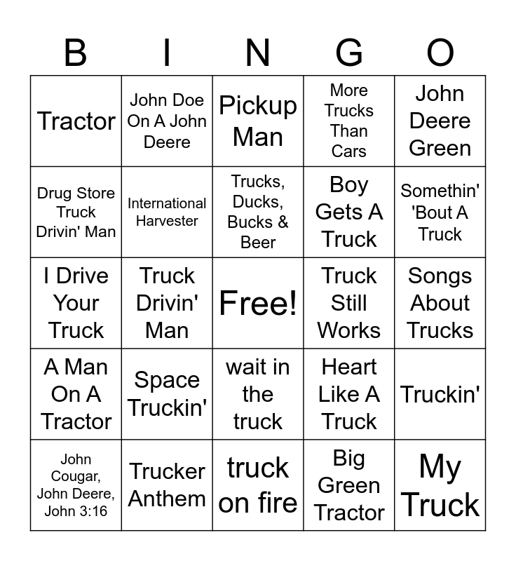 This bingo card has a free space and 34 words: She Thinks My Tractor's Sexy, Big Green Tractor, Tractor Tipping, She Cranks My Tractor, A Man On A Tractor, International Harvester, John Deere Green, John Cougar, John Deere, John 3:16, John Doe On A John Deere, We Rode In Trucks, Trucks, Ducks, Bucks & Beer, Pickup Man, That Ain't My Truck, Truck Yeah, Truck Still Works, Somethin' 'Bout A Truck, Trucker Anthem, I Drive Your Truck, Space Truckin', Heart Like A Truck, wait in the truck, Truck Bed, Tractor, Songs About Trucks, truck on fire, My Truck, More Trucks Than Cars, If My Truck Could Talk, Boy Gets A Truck, Drug Store Truck Drivin' Man, Tractor Man, Truck Drivin' Man, Truckin' and Roll On (Eighteen Wheeler).