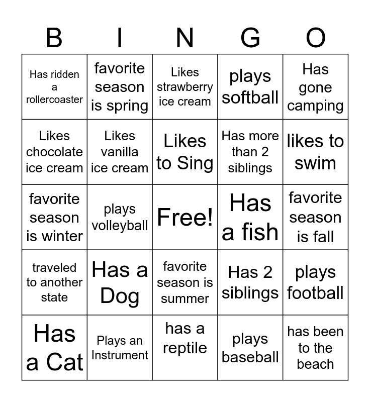 This bingo card has a free space and 24 words: Has a Dog, Plays an Instrument, Likes to Sing, Has a Cat, Has gone camping, Has ridden a rollercoaster, Likes chocolate ice cream, favorite season is spring, Has a fish, favorite season is summer, Has more than 2 siblings, favorite season is winter, Has 2 siblings, plays football, Likes vanilla ice cream, plays baseball, favorite season is fall, Likes strawberry ice cream, likes to swim, plays volleyball, has been to the beach, traveled to another state, plays softball and has a reptile.
