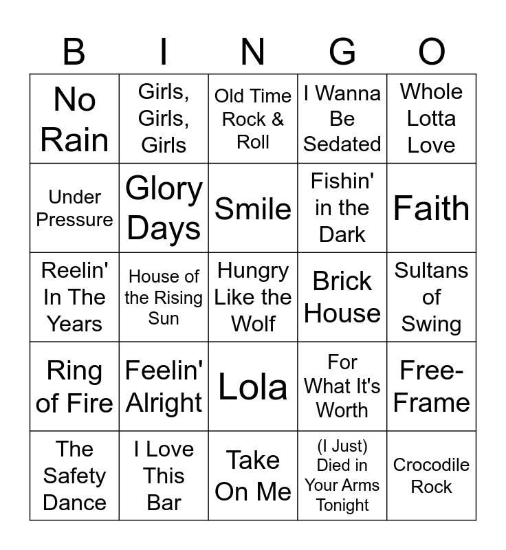 This bingo card has 31 words: Take On Me, Sweet Emotion, House of the Rising Sun, Let Your Love Flow, No Rain, Old Time Rock & Roll, Glory Days, For What It's Worth, Brick House, (I Just) Died in Your Arms Tonight, Sultans of Swing, Hungry Like the Wolf, Crocodile Rock, The Way You Love Me, Faith, No Sugar Tonight, Free-Frame, Feelin' Alright, Ring of Fire, Lola, Whole Lotta Love, Do Wah Diddy Diddy, The Safety Dance, Girls, Girls, Girls, Fishin' in the Dark, Under Pressure, I Wanna Be Sedated, Reelin' In The Years, I Love This Bar, Smile and Time of the Season.