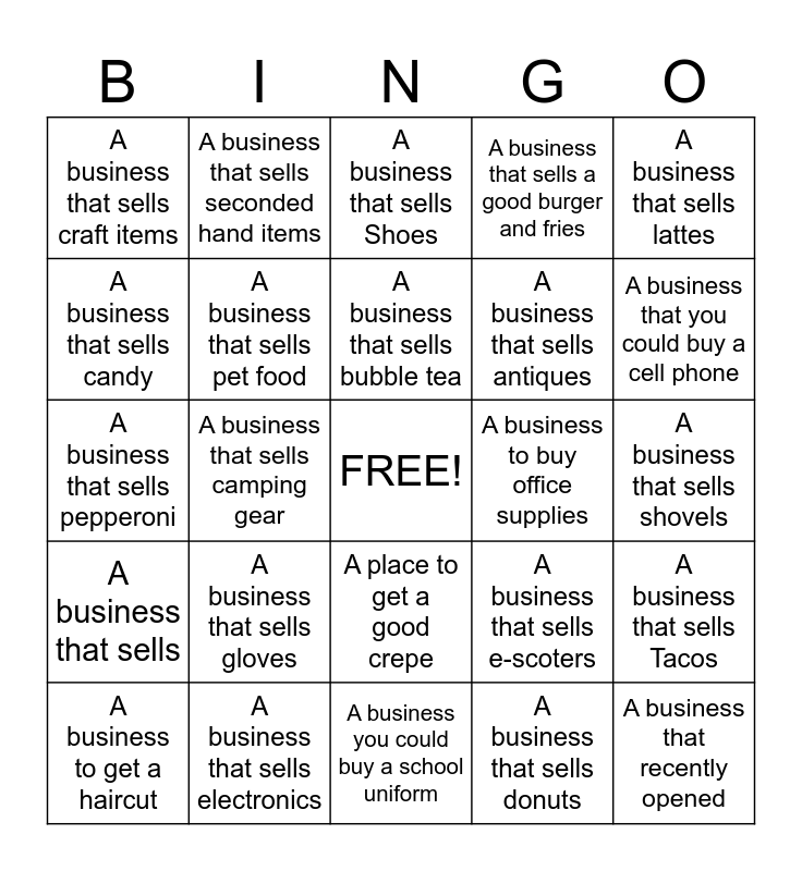 This bingo card has a free space and 24 words: A business that sells gloves, A business that sells electronics, A business that sells bubble tea, A business to get a haircut, A business that sells lattes, A business that sells craft items, A business that sells candy, A business that sells seconded hand items, A business to buy office supplies, A place to get a good crepe, A business that sells antiques, A business that sells pepperoni, A business that sells e-scoters, A business that sells Tacos, A business that sells pet food, A business that sells donuts, A business that sells shovels, A business that sells Shoes, A business that you could buy a cell phone, A business that sells camping gear, A business that recently opened, A business that sells, A business that sells a good burger and fries and A business you could buy a school uniform.