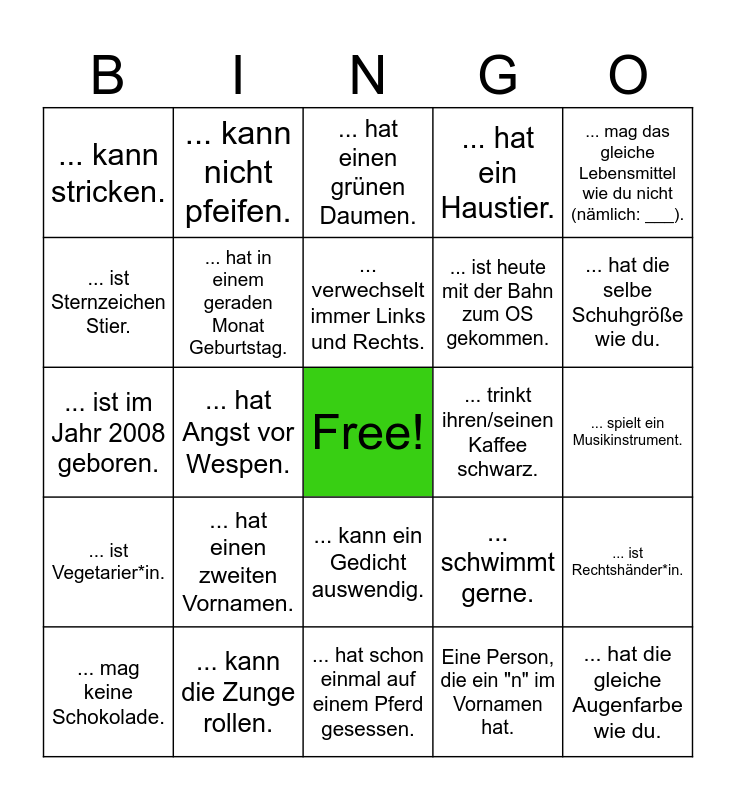 This bingo card has a free space and 24 words: ... hat einen zweiten Vornamen., ... kann die Zunge rollen., ... verwechselt immer Links und Rechts., ... mag keine Schokolade., ... mag das gleiche Lebensmittel wie du nicht (nämlich: ___)., ... kann stricken., ... ist Sternzeichen Stier., ... kann nicht pfeifen., ... trinkt ihren/seinen Kaffee schwarz., ... kann ein Gedicht auswendig., ... ist heute mit der Bahn zum OS gekommen., ... ist im Jahr 2008 geboren., ... schwimmt gerne., ... ist Rechtshänder*in., ... hat in einem geraden Monat Geburtstag., Eine Person, die ein "n" im Vornamen hat., ... spielt ein Musikinstrument., ... hat einen grünen Daumen., ... hat die selbe Schuhgröße wie du., ... hat Angst vor Wespen., ... hat die gleiche Augenfarbe wie du., ... ist Vegetarier*in., ... hat ein Haustier. and ... hat schon einmal auf einem Pferd gesessen..