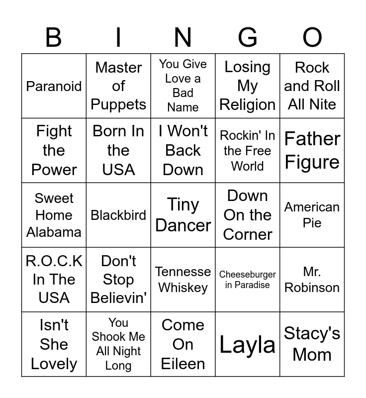 This bingo card has 30 words: You Shook Me All Night Long, Ramblin' Man, Blackbird, Piano Man, Paranoid, You Give Love a Bad Name, Born In the USA, Tennesse Whiskey, Down On the Corner, Come On Eileen, American Pie, Tiny Dancer, Layla, Stacy's Mom, Father Figure, Redneck Woman, Cheeseburger in Paradise, R.O.C.K In The USA, Don't Stop Believin', Rock and Roll All Nite, Sweet Home Alabama, Can't You See, Master of Puppets, Rockin' In the Free World, Fight the Power, Losing My Religion, Mr. Robinson, Isn't She Lovely, I Won't Back Down and Here I Go Again '87.