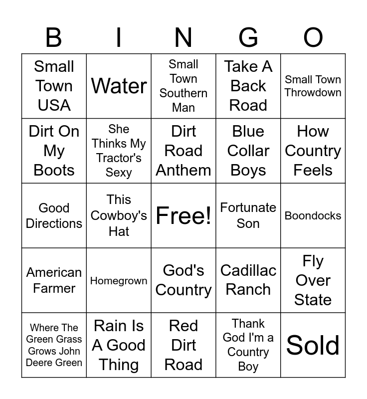 This bingo card has a free space and 35 words: Big Green Tractor, Farmer's Daughter, International Harvester, She Thinks My Tractor's Sexy, God's Country, Take A Back Road, Dirt On My Boots, When It Rains It Pours, Dirt Road Anthem, Wagon Wheel, Good Directions, Small Town Throwdown, Fishin' in the Dark, Hillbilly Bone, Small Town USA, Fortunate Son, Thank God I'm a Country Boy, This Cowboy's Hat, American Farmer, Sold, Cadillac Ranch, Where The Green Grass Grows John Deere Green, Fly Over State, Rain Is A Good Thing, Small Town Southern Man, How Country Feels, Pickup Man, This Is How We Roll, Blue Collar Boys, Boondocks, American Ride, Red Dirt Road, Homegrown, Water and Yee Haw.
