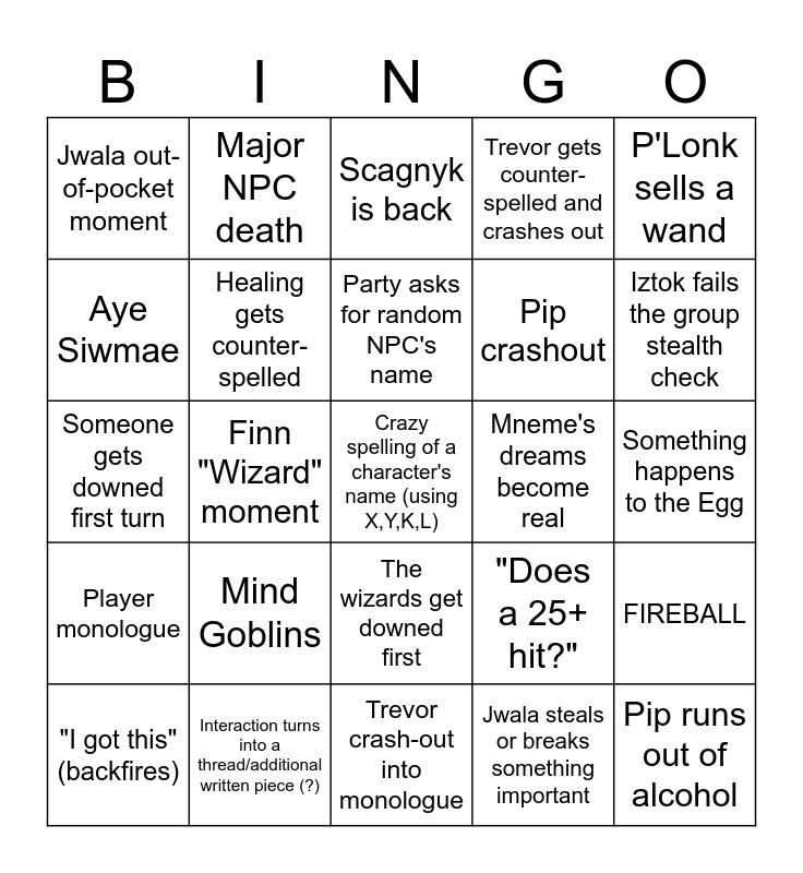This bingo card has 50 words: Free!, Crazy spelling of a character's name (using X,Y,K,L), Maze Puzzle, Trevor crash-out into monologue, Mind Goblins, Keduvec shenanigans, Major NPC death, Ptolemy tragic backstory, Aye Siwmae, Physics rant/moment, Healing gets counter-spelled, Trevor gets counter-spelled and crashes out, FIREBALL, "Does a 25+ hit?", Brainrot Moment that leads to a 1+ hour tangent, NPC Betrayal, Party asks for random NPC's name, Mneme's dreams become real, P'Lonk's Dark Past revealed, P'Lonk sells a wand, Finn "Wizard" moment, Jwala steals or breaks something important, Jwala out-of-pocket moment, Pip crashout, Pip goes one session without drinking, Pip runs out of alcohol, Iztok fails the group stealth check, Iztok turns pink / crazy color, Scagnyk is back, The wizards get downed first, Super cool magical items that's cursed or super plot-relevant, Benevolent DM, Creepy, cryptic shopkeeper, Past PC appears or is mentioned, Interaction turns into a thread/additional written piece (?), Party plans something out and then fails to execute it, Party convinces Trevor to let a creative solution work, Party uses creative solution and Trevor seethes, Trevor forgets something in session and has to send post-session, Something happens to the Egg, Fae Shenanigans, Party goes into a Identify Spree, Traveling dwarf merchant, Travel to Imaan/Vronir goes awry, "I got this" (backfires), Someone gets downed first turn, No one in the party has 10+ roll for initiative, Someone breaks into song, Player monologue and Savlian appearance.