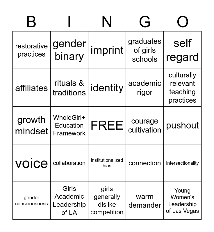 This bingo card has a free space and 24 words: collaboration, Girls Academic Leadership of LA, identity, gender consciousness, self regard, restorative practices, affiliates, gender binary, courage cultivation, institutionalized bias, academic rigor, growth mindset, connection, intersectionality, rituals & traditions, warm demander, pushout, imprint, culturally relevant teaching practices, WholeGirl+ Education Framework, Young Women's Leadership of Las Vegas, voice, graduates of girls schools and girls generally dislike competition.