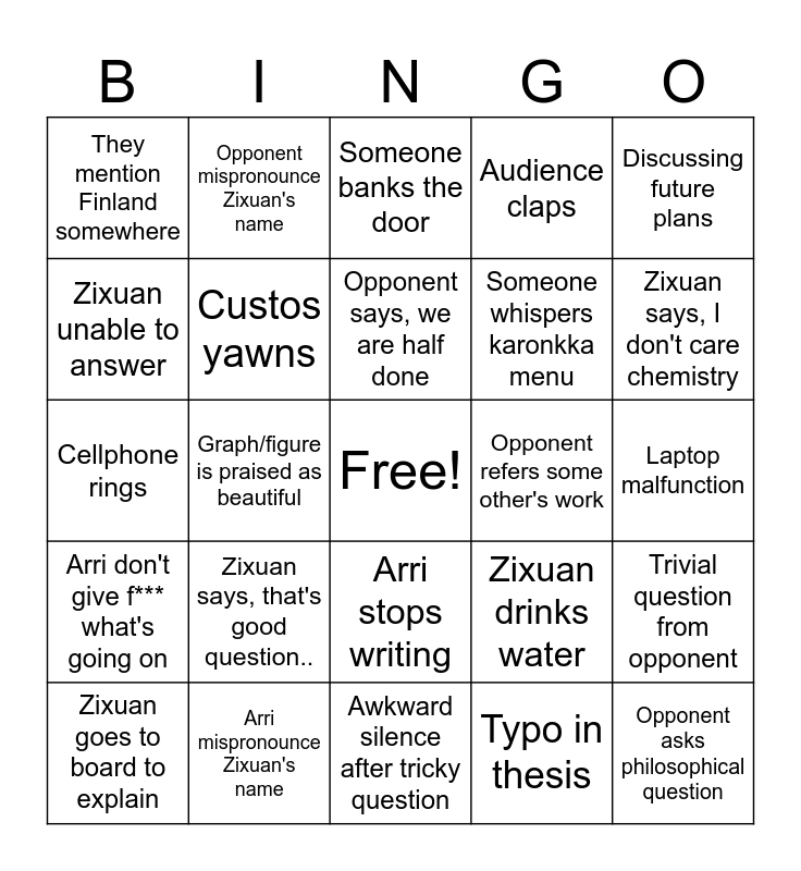 This bingo card has a free space and 24 words: Zixuan says, that's good question.., Arri mispronounce Zixuan's name, Opponent says, we are half done, Zixuan goes to board to explain, Discussing future plans, They mention Finland somewhere, Zixuan unable to answer, Opponent mispronounce Zixuan's name, Opponent refers some other's work, Arri stops writing, Someone whispers karonkka menu, Cellphone rings, Zixuan drinks water, Trivial question from opponent, Custos yawns, Typo in thesis, Laptop malfunction, Someone banks the door, Zixuan says, I don't care chemistry, Graph/figure is praised as beautiful, Opponent asks philosophical question, Arri don't give f*** what's going on, Audience claps and Awkward silence after tricky question.