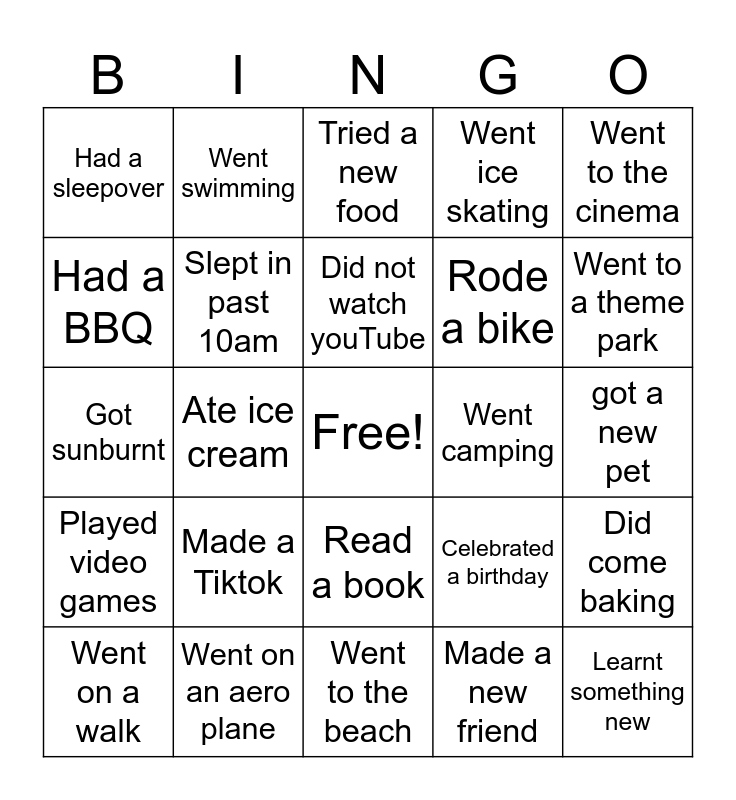 This bingo card has a free space and 24 words: Made a Tiktok, Went on an aero plane, Did not watch youTube, Went on a walk, Went to the cinema, Had a sleepover, Had a BBQ, Went swimming, Went camping, Read a book, Rode a bike, Got sunburnt, Celebrated a birthday, Did come baking, Slept in past 10am, Made a new friend, got a new pet, Tried a new food, Went to a theme park, Ate ice cream, Learnt something new, Played video games, Went ice skating and Went to the beach.